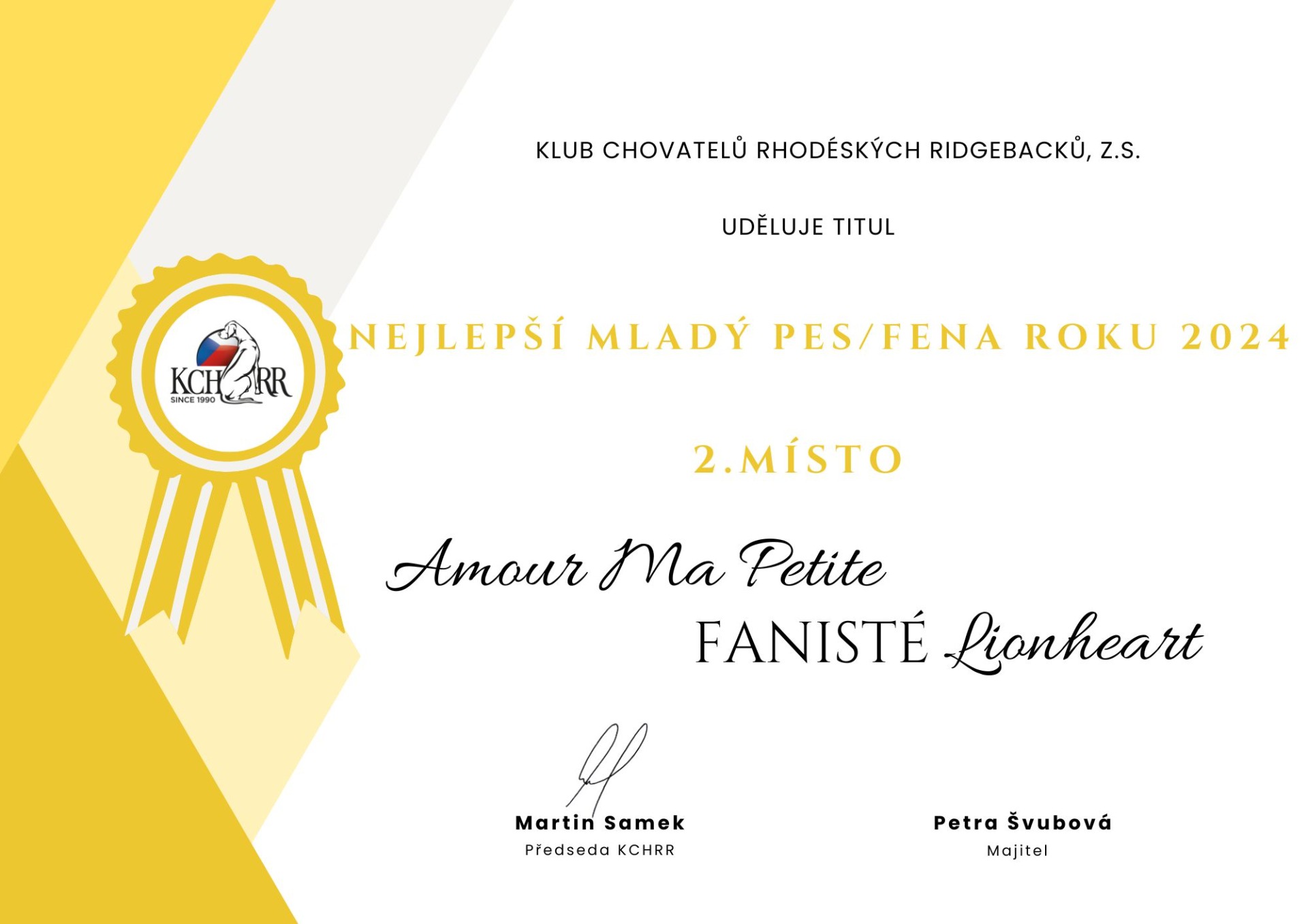 KCHRR - v tomto roce se Bianka stává druhým nejkrásnějším mladým jedincem s nádherným počtem bodů 844 a zároveň je na prvním místě jako nejkrásnější mladá fenka v těchto soutěžích. K tomuto umístění přidává i titul Klubový šampion KCHRR