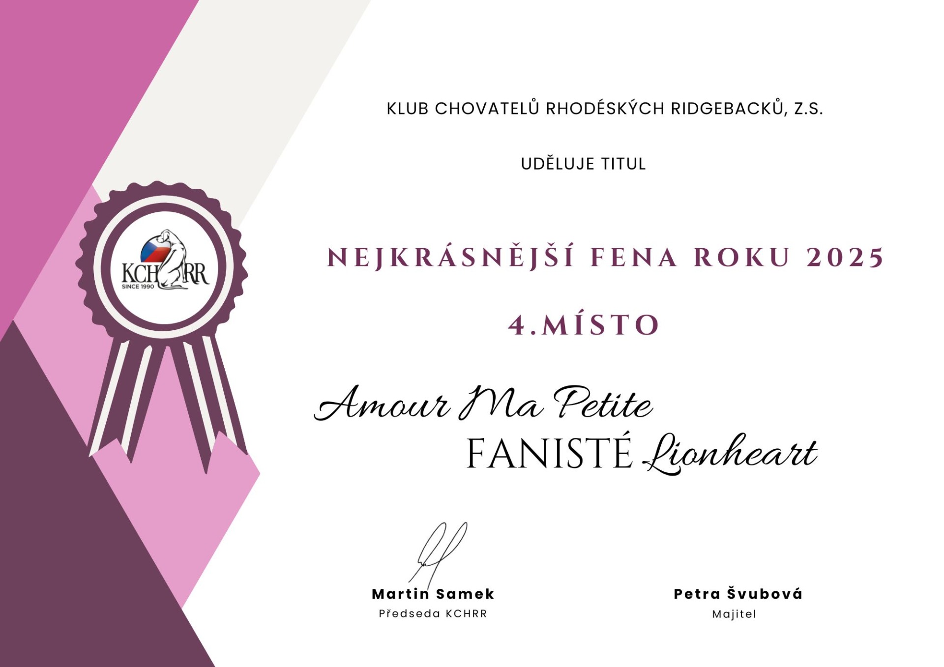 KCHRR - i v tomto roce se Bianka umístila v popředí i přes absolvování pár výstav, získala nádherné 4. místo mezi dospělými fenami s počtem bodů 869